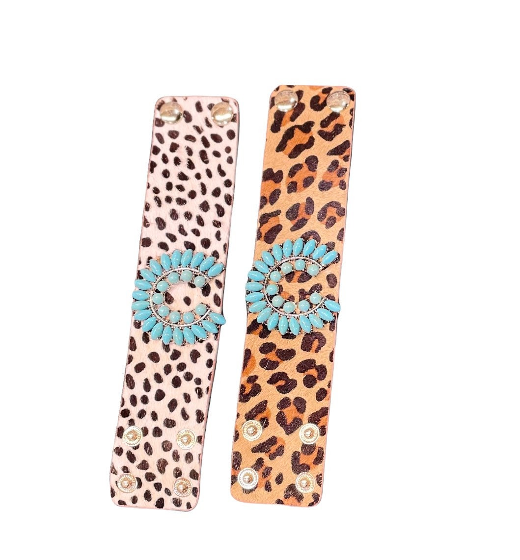 Turquoise Stone Animal Leather Print BraceletAdjustable button back Width: 1.8” inches
